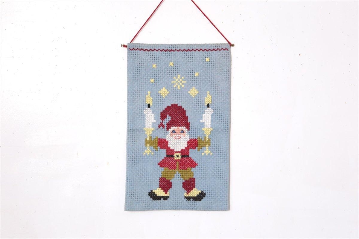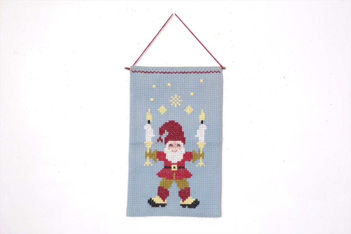 スウェーデンで買い付けたクリスマスのタペストリーです。 キャンドルを手ににっこり笑うトムテが楽しい絵柄です。 ひもまで入れると長さ70cmです。 古い生地ですので、多少の使用感はございますが、良いコンディションです。