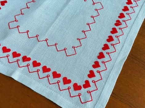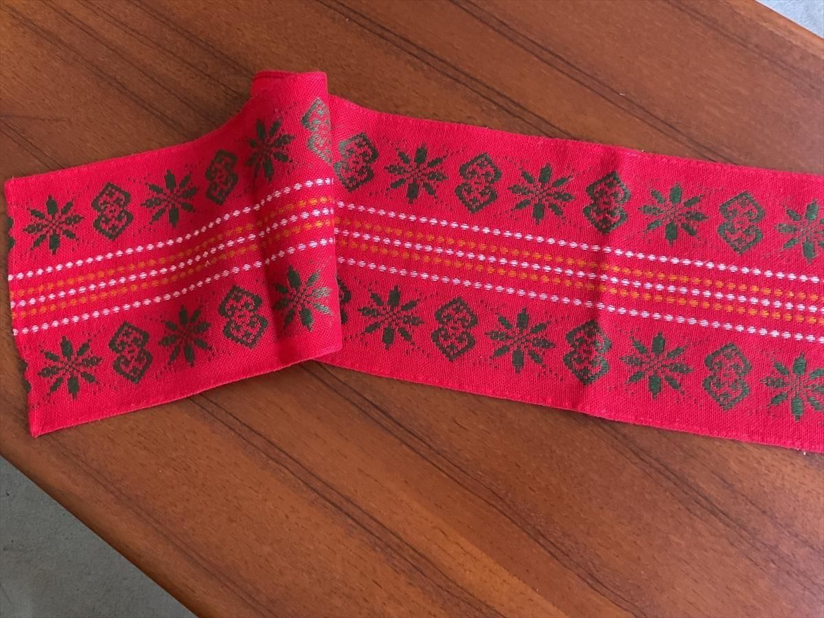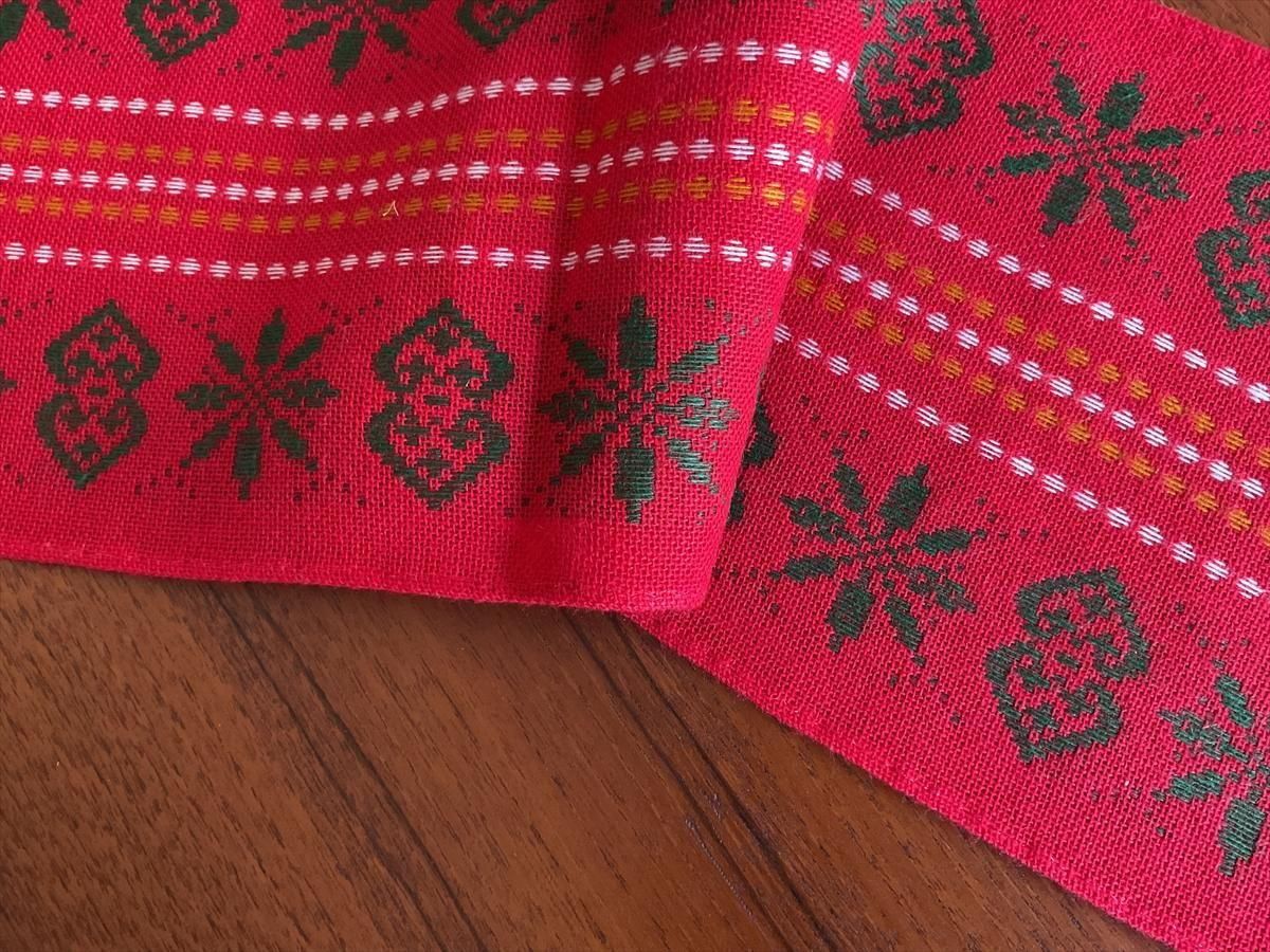 スウェーデンで買い付けたクリスマスの細長いテーブルセンターです。スノーとハートの織り模様が可愛いですね。実際の色はもう少し落ち着いた赤と緑です。化繊入りですのでしわになりにくい素材ですが、アイロンをかける場合は低温で軽くかけてください。 古い生地ですので、多少の使用感はございますが、お楽しみいただけることと思います。