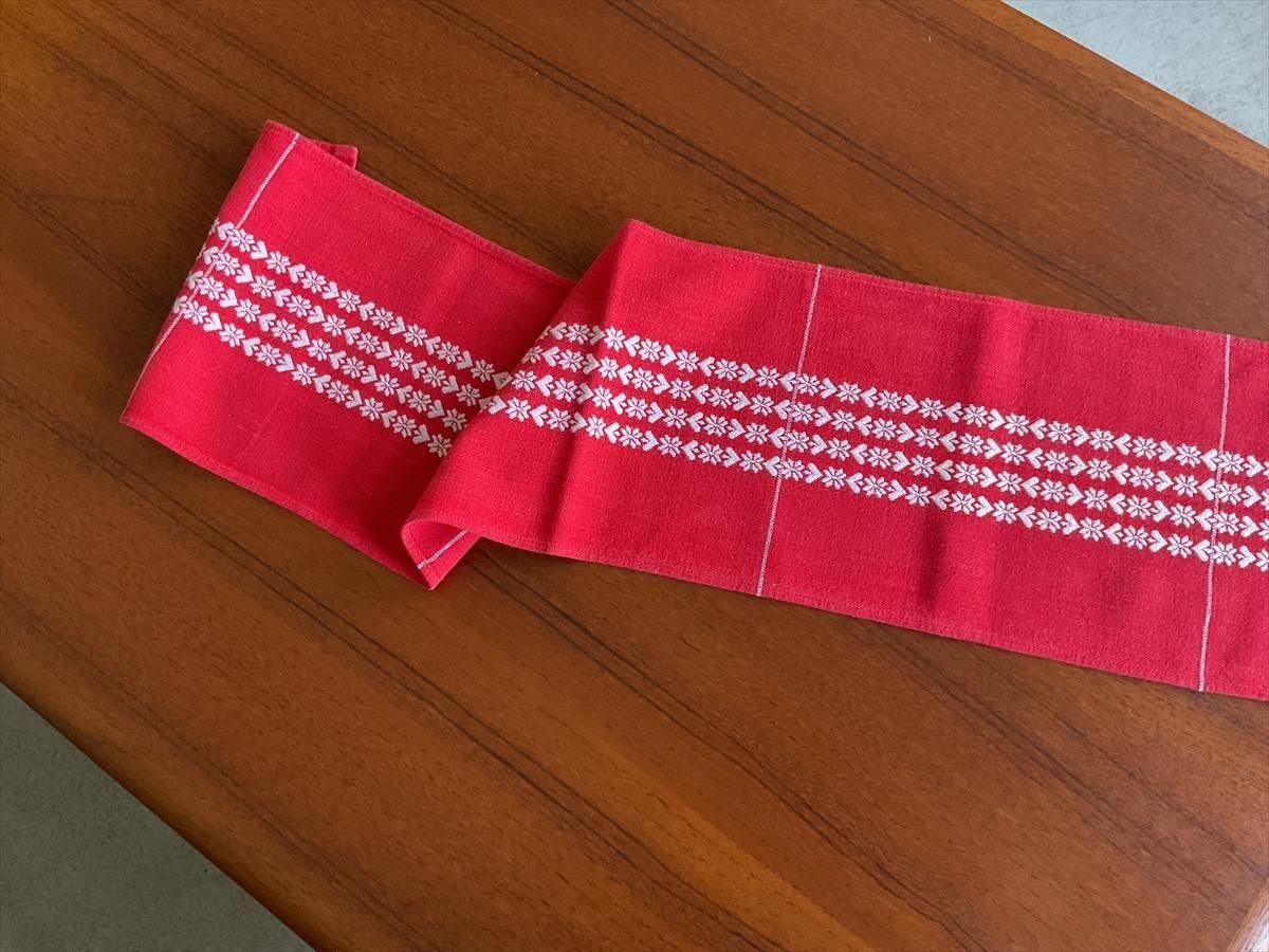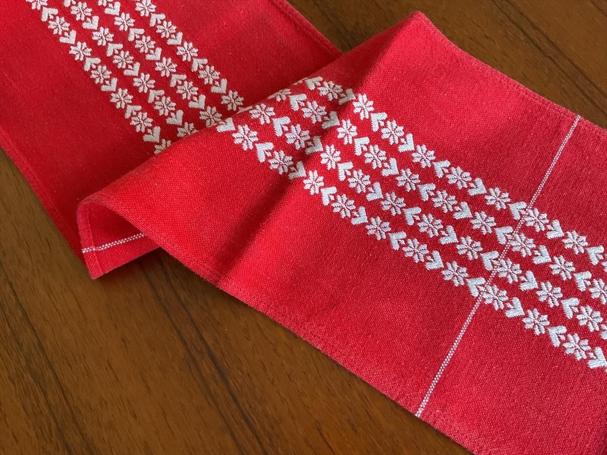 スウェーデンで買い付けたクリスマスの細長いテーブルセンターです。テーブルや棚の上にぴったりなサイズで、スノーとハートの伝統的な織り模様がすてきです。やわかい生地です。 古い生地ですので、多少の使用感はございますが、お楽しみいただけることと思います。