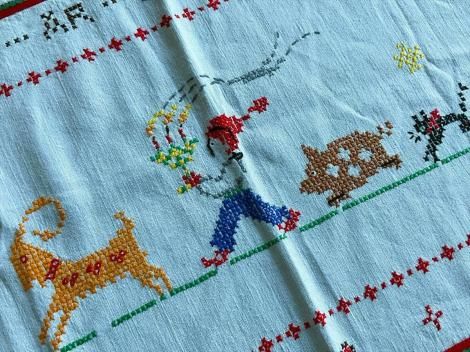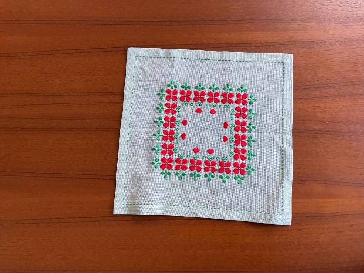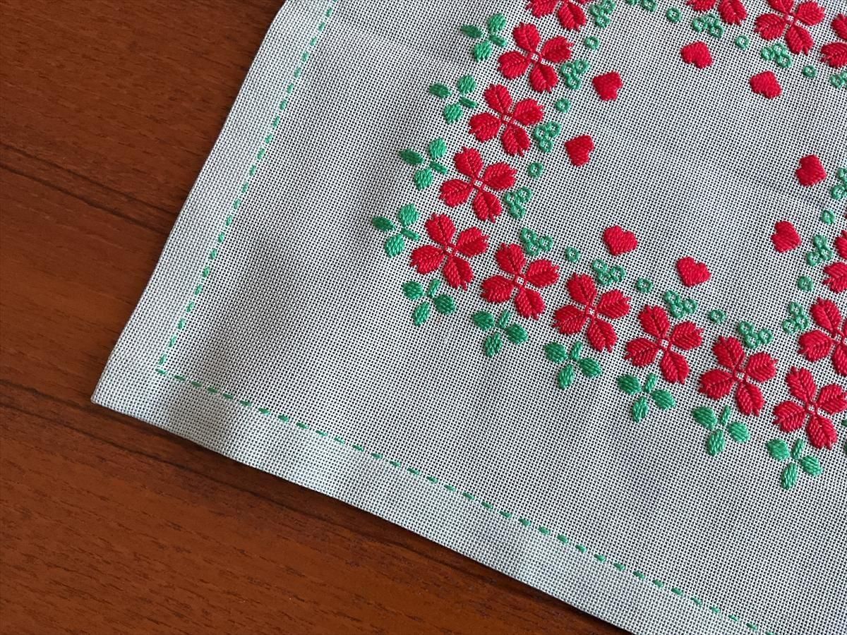 スウェーデンで買い付けたクリスマスのテーブルセンターです。赤い花とハートがすてきなクロスです。淡いグレーグリーンのしっかりした張りのある生地です。 古い生地ですので、多少の使用感はございますが、お楽しみいただけることと思います。