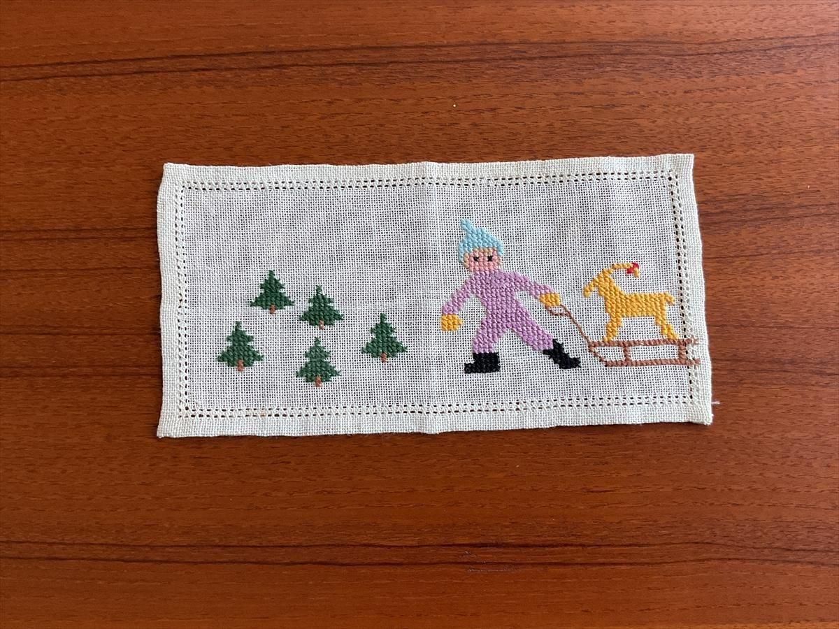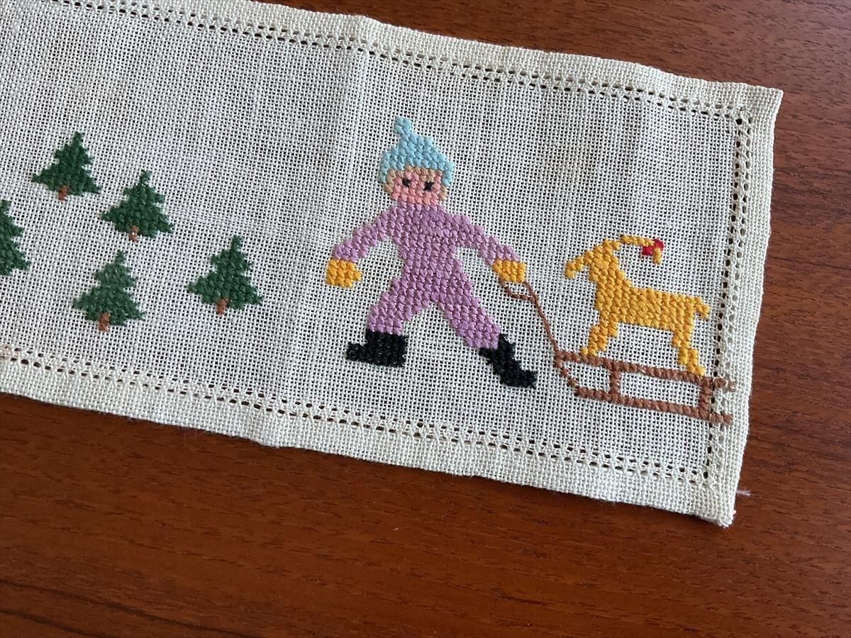 スウェーデンで買い付けたクリスマスのミニクロスです。クリスマスに欠かせない麦わらの山羊をそりにのせて運ぶ子供の姿が何とも言えないかわいさです。壁に掛けてもかわいいですね。 古い生地ですので、多少の使用感はございますが、お楽しみいただけることと思います。