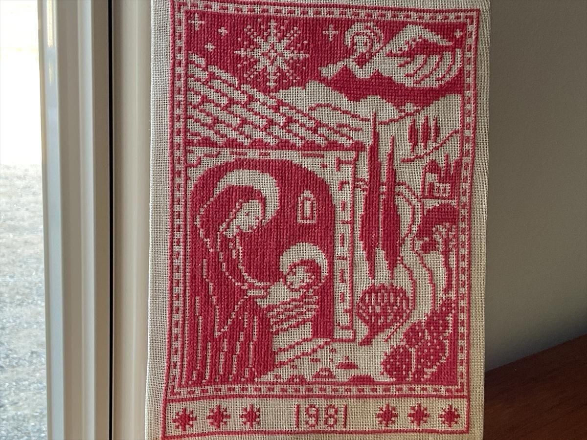 スウェーデンで買い付けたクリスマスのタペストリーです。スウェーデンで1950年代から毎年発表されているクリスマスの図案の小さなタペストリーです。1981年のこちらはイエス誕生の絵柄です。 ピンクの細い糸で細かいクロスステッチで丁寧に刺しゅうされています。下の方と裏側にわずかなしみがりますがお楽しみいただけることと思います。芯に厚紙が入っており裏に壁掛け用のリボンがあります。
