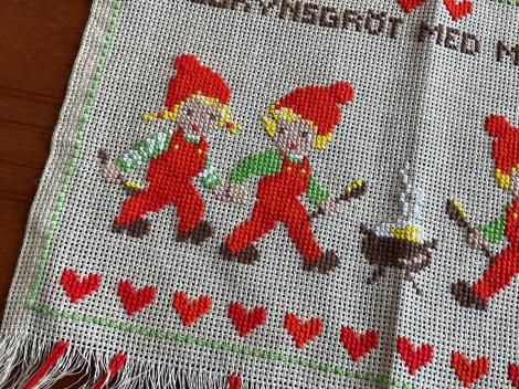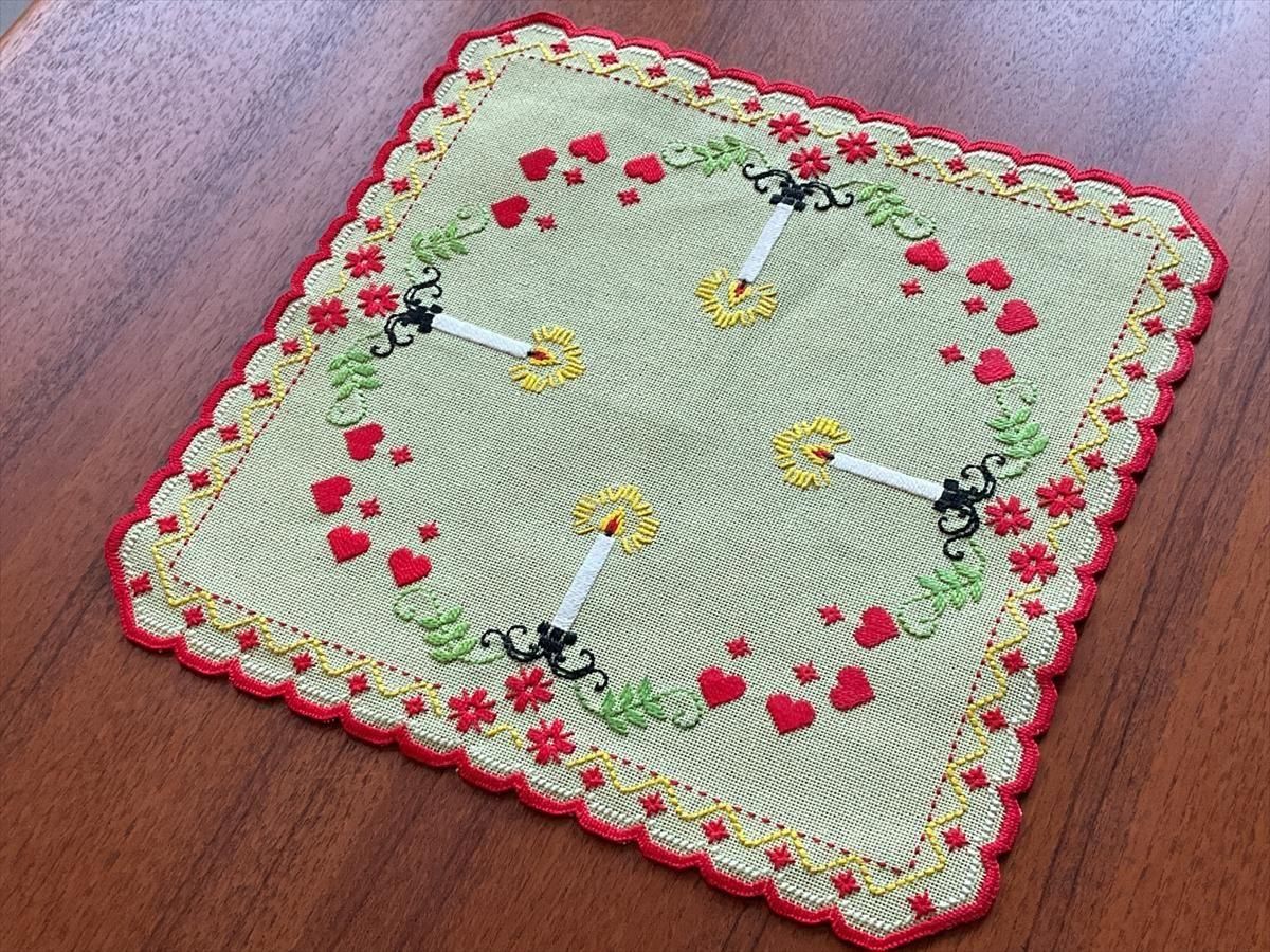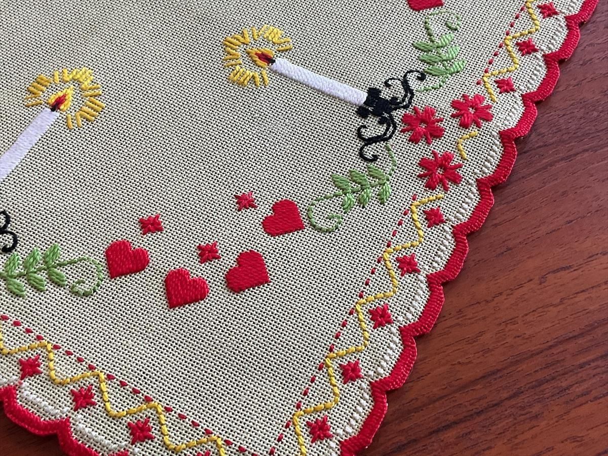 スウェーデンで買い付けたクリスマスのテーブルセンターです。キャンドルとハートと小花模様がかわいいクロスです。黄緑色と赤の色合いもすてきです。生地は張りのある刺しゅう用の生地です。 古い生地ですので、多少の使用感はございますが、お楽しみいただけることと思います。