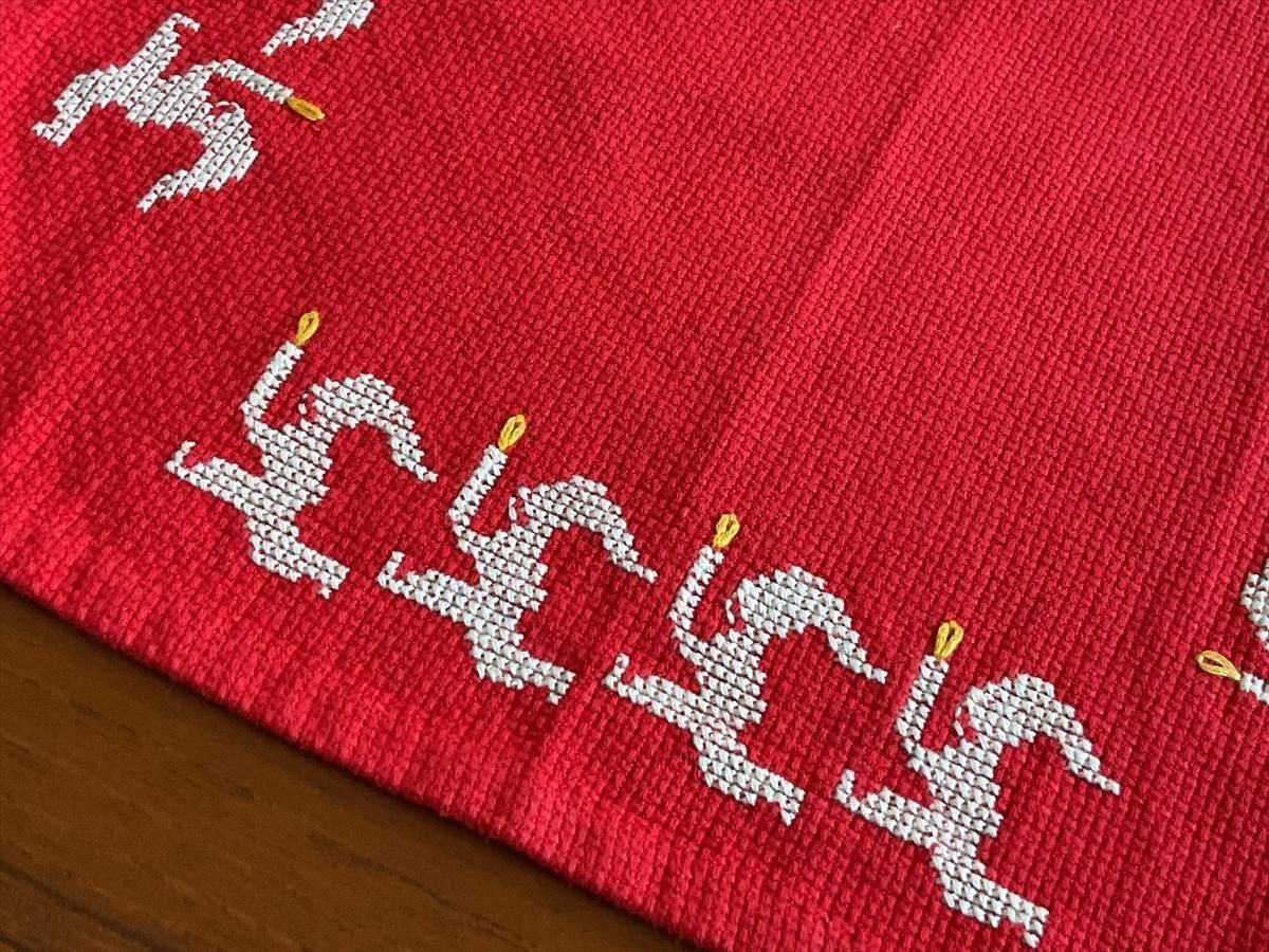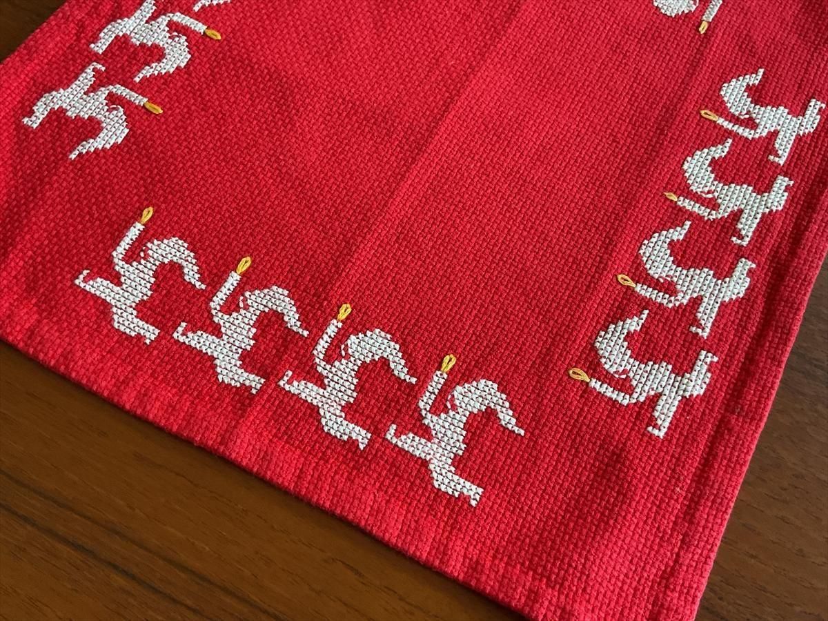 スウェーデンで買い付けたクリスマスのテーブルセンターです。赤の生地に白のクロスステッチでトムテが描かれたクロスです。キャンドルを持って走る姿が何ともかわいいです。 古い生地ですので、多少の使用感はございますが、お楽しみいただけることと思います。